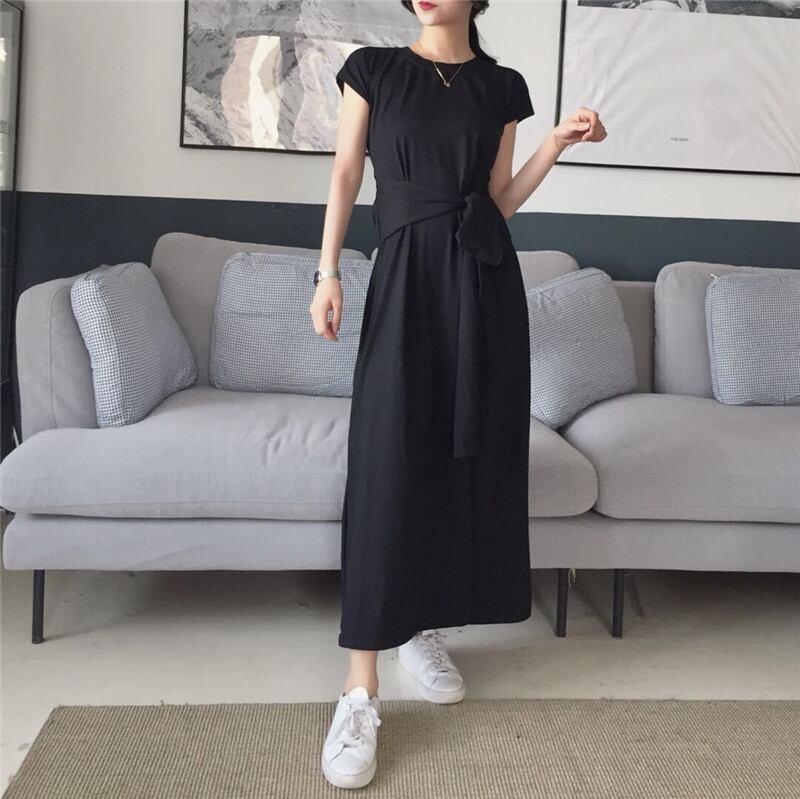サラッと着られるウエストストラップのロング丈半袖ワンピースです。