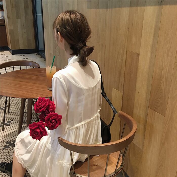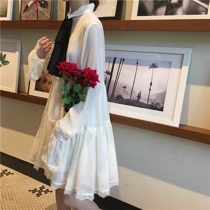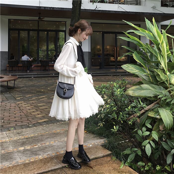 秋新作☆レース付き シフォンティアードワンピース 長袖 リボンタイ バイカラー ギャザー フリル 透け感 ガーリー キュート D1001