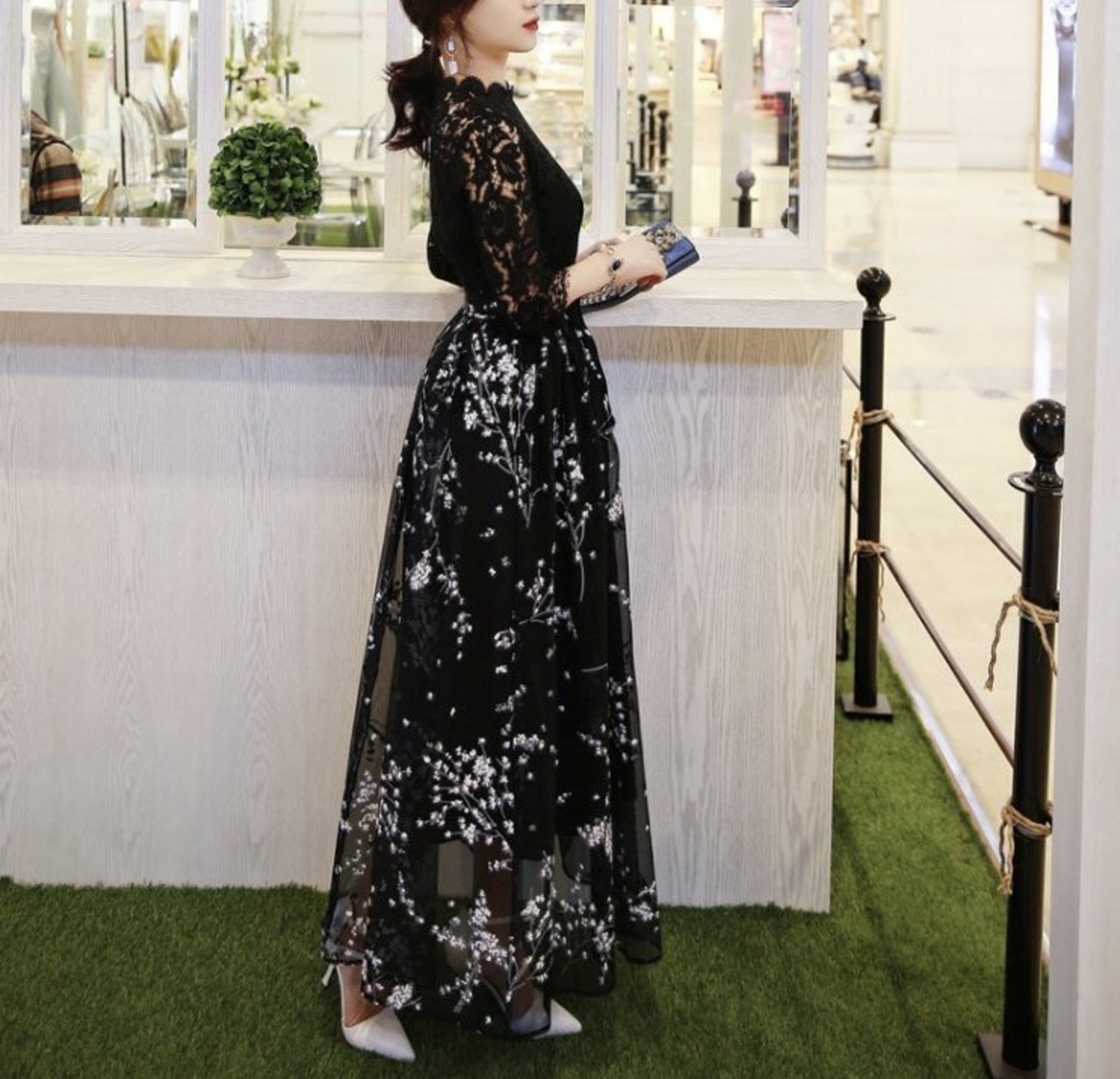 レース×花柄の組み合わせが可愛いブラックドレスです。
