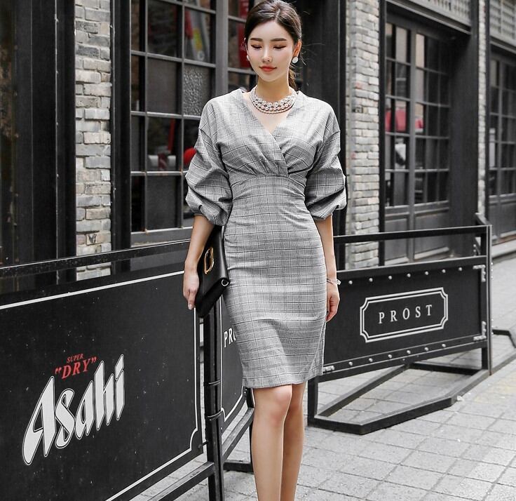 シックで落ち着いたグレンチェック柄のスリムワンピースです。