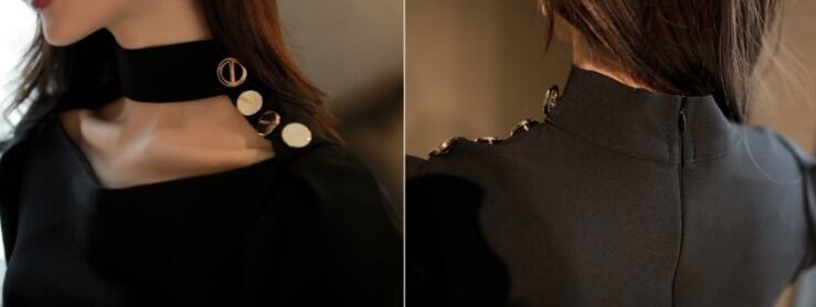 ネックラインがカットされてデコルテ魅せがきれいにキマるブラックワンピース。