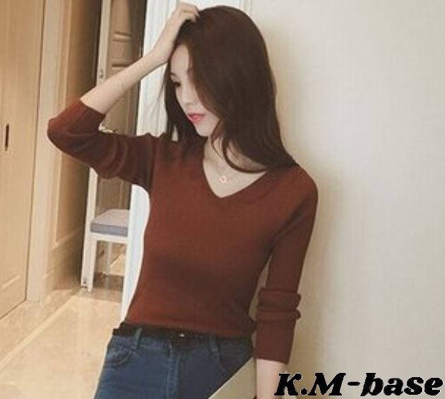 Vネックデザインがエレガントな女性に見せてくれるVネックのリブニットセーター。
