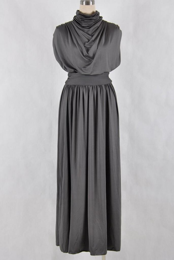 ハイネックときれいなドレープが特徴的なマキシ丈ドレスです。