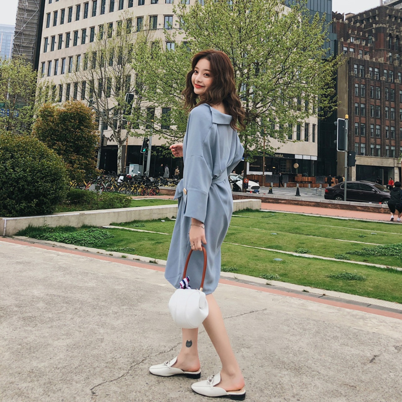 トレンド☆くすみカラー ルーズシルエットワンピース ドロップショルダー ボリューム袖 スキッパーシャツ 抜き襟 抜け感 ゆる感 D1015