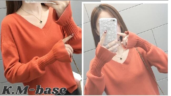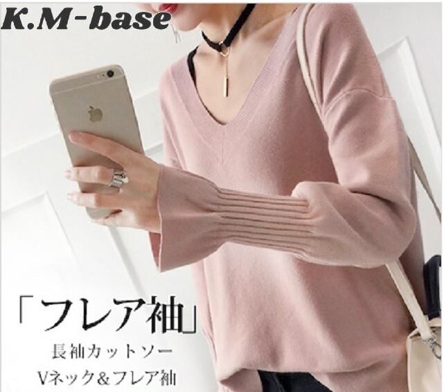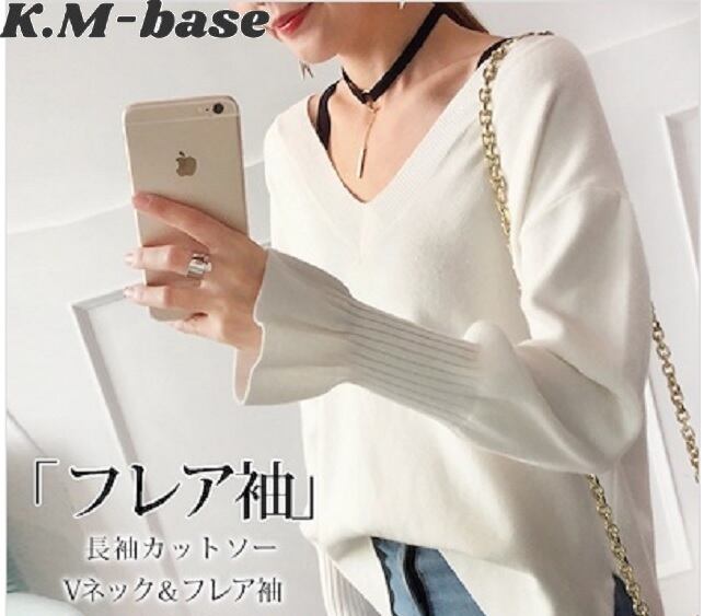 ネックがスッキリあいたシルエットの長袖ニットソー