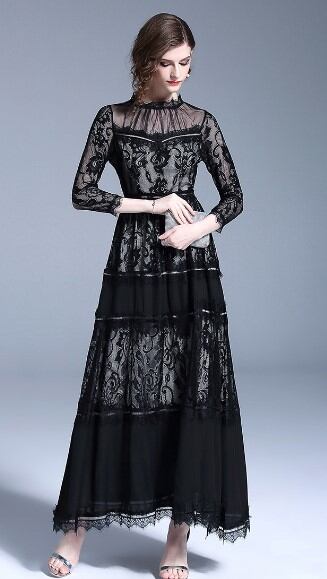 切替のティアードスカートが可愛いレーシーなブラックドレスです。