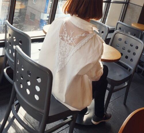 背中がオープンになって大きなレースが施されたバックシャンなシャツ。