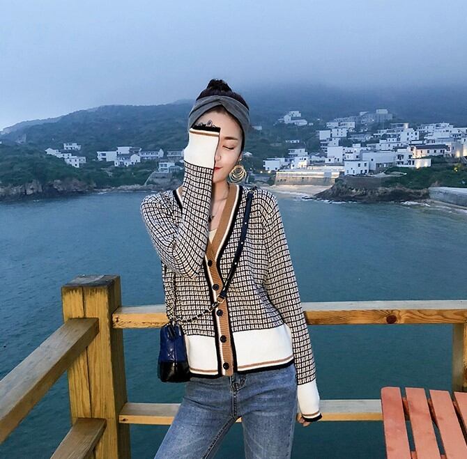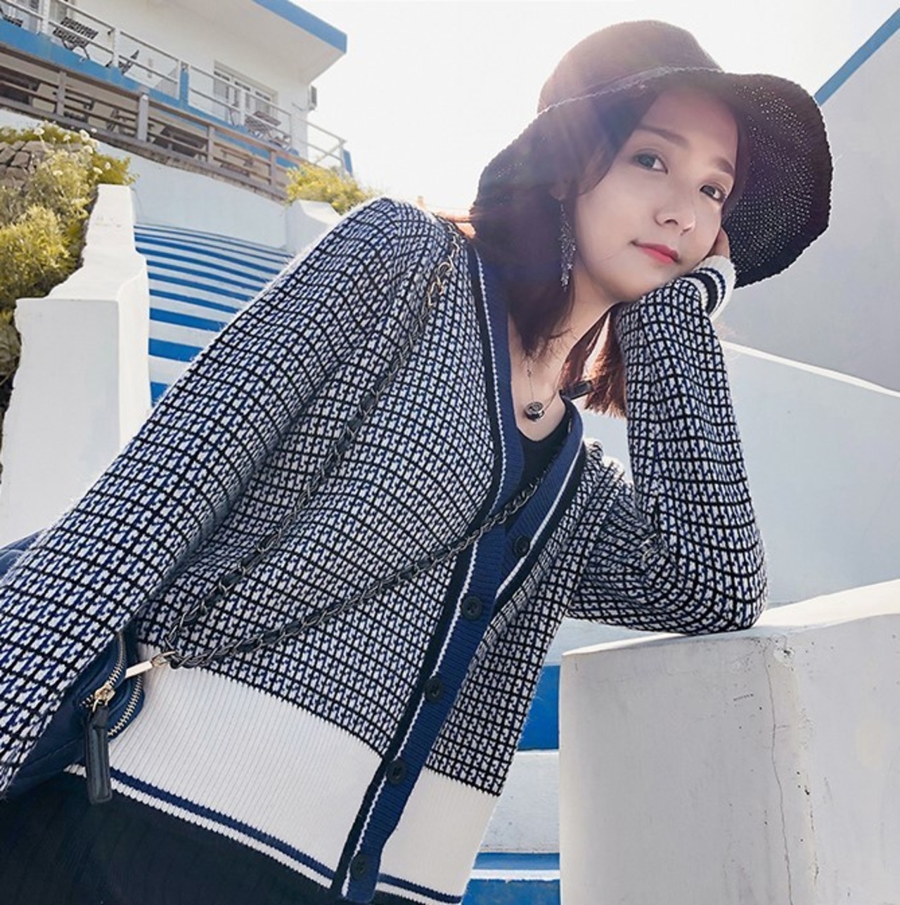 レトロ調のモダンな柄使いがオシャレなVネックニットカーディガン。