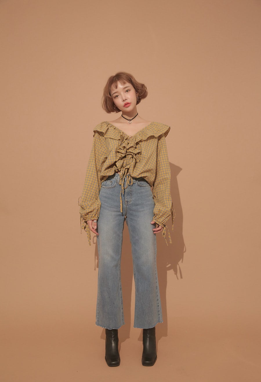 トレンド☆レトロチェック柄 フリル付きVネックブラウス 長袖 ランタンスリーブ カジュアル ガーリー キュート 秋冬 B1073