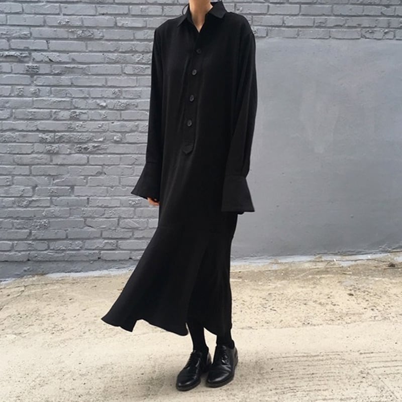 レトロシックなマキシ丈ブラックワンピース シャツワンピース ベルスリーブ 裾フリル フラウンス モード 細見え D1061