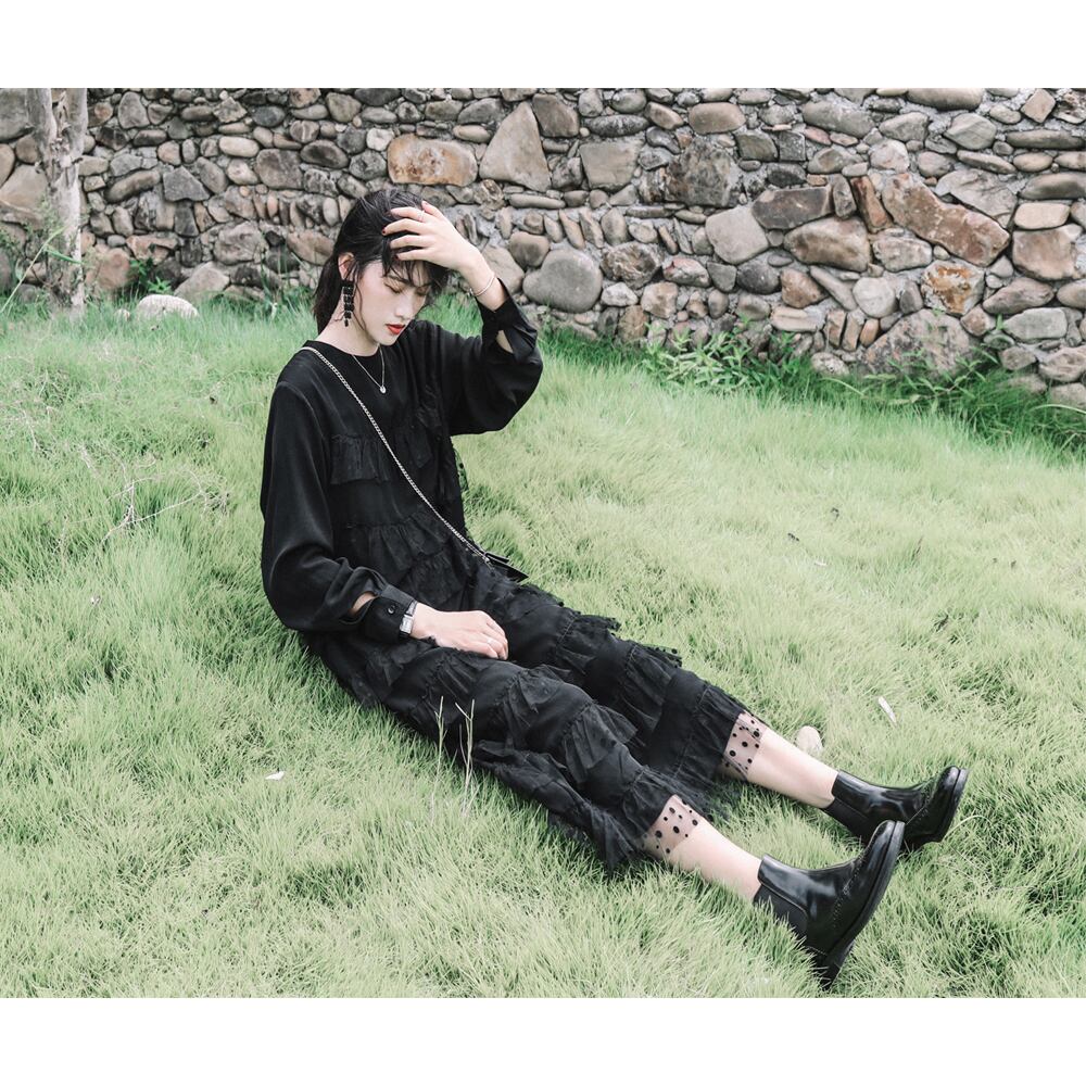 ドット柄チュールレース付きロングワンピース ティアードワンピース ロング丈 長袖 ギャザーフリル ブラックワンピース シック ガーリー お出掛け お呼ばれ D1064