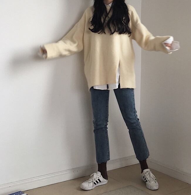 シンプルデザインでボトムを選ばす着回し力抜群のニットです。