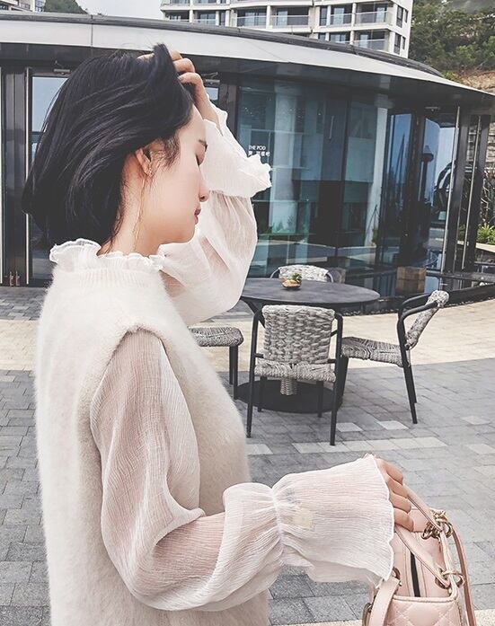 大人キレイを存分に表現してくれるフリル襟の付いたフェミニンなブラウスですとベストです。