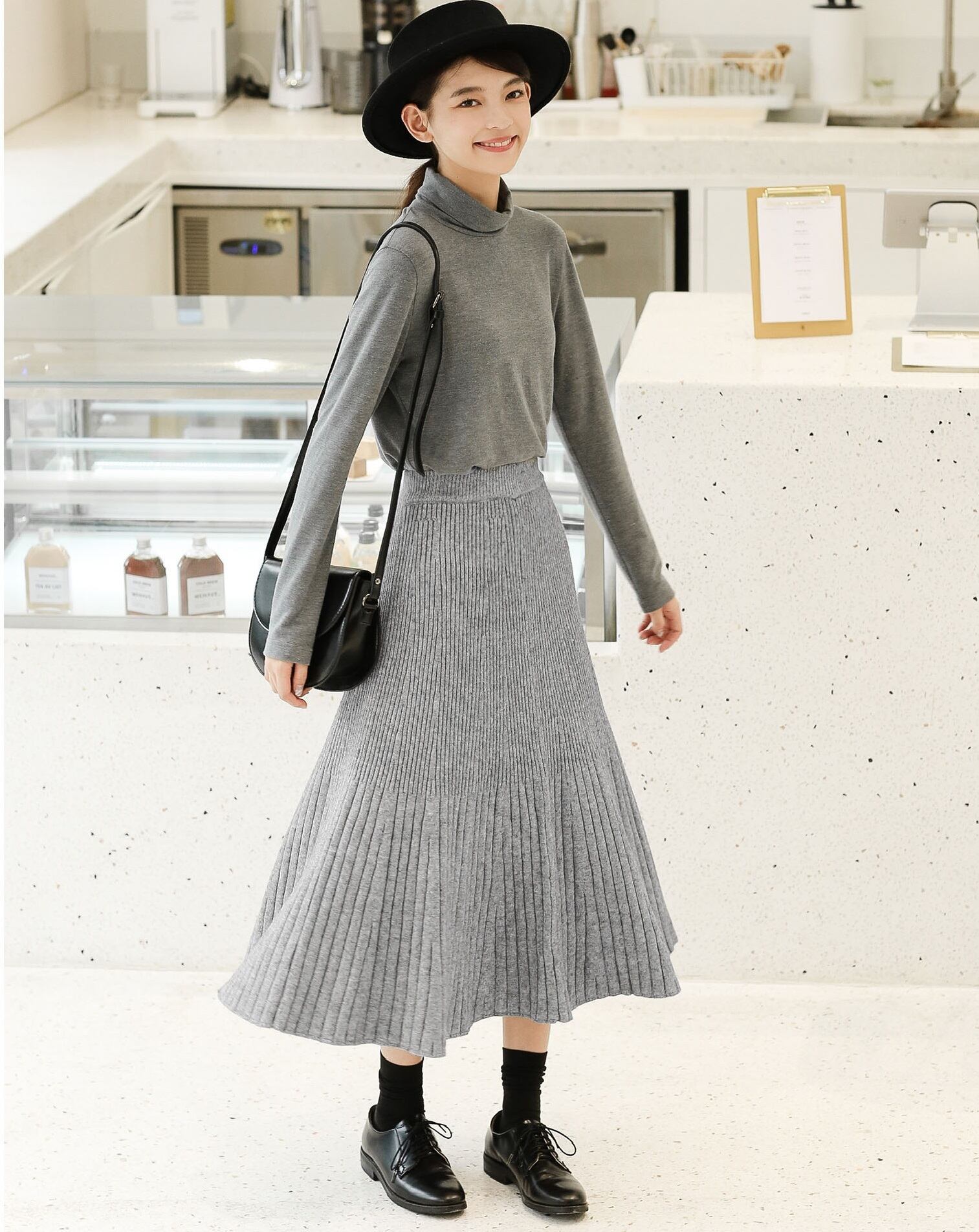ニット素材の柔らかな印象と、プリーツの女性らしさがポイントとなったロングスカート。