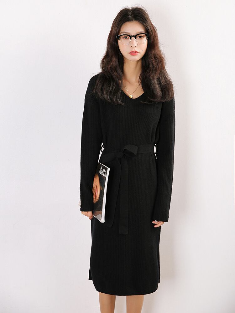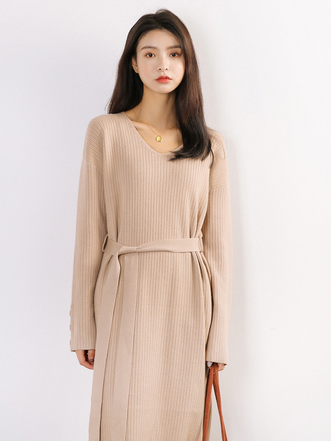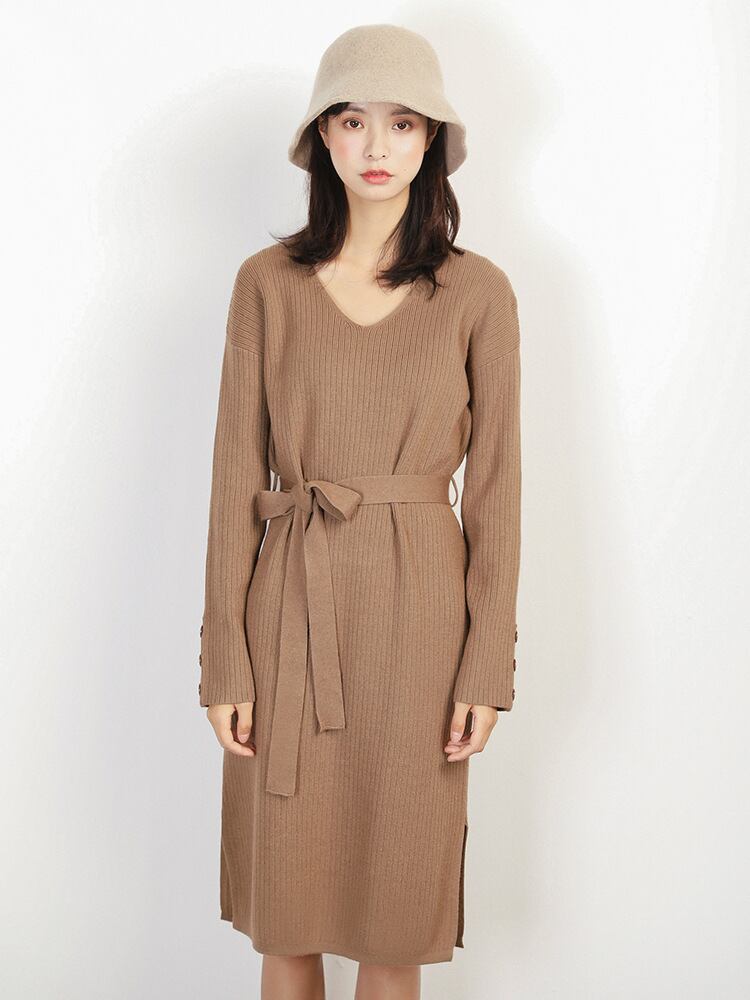 Vネックやウエストのリボンがとってもフェミニンなニットワンピース☆