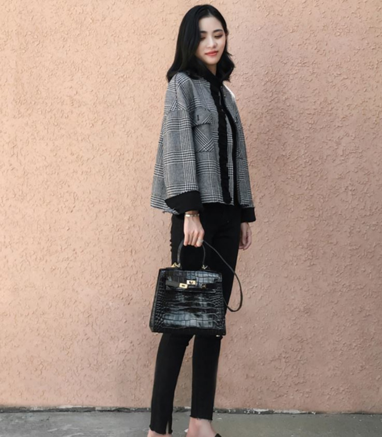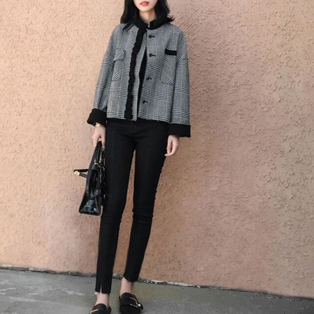 落ち着いたモノトーンのチェック柄がお洒落なノーカラージャケット☆