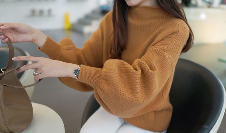 ふんわりフォルムのお袖がフェミニンな、シンプルでどんなコーデにも合う定番ニット♪