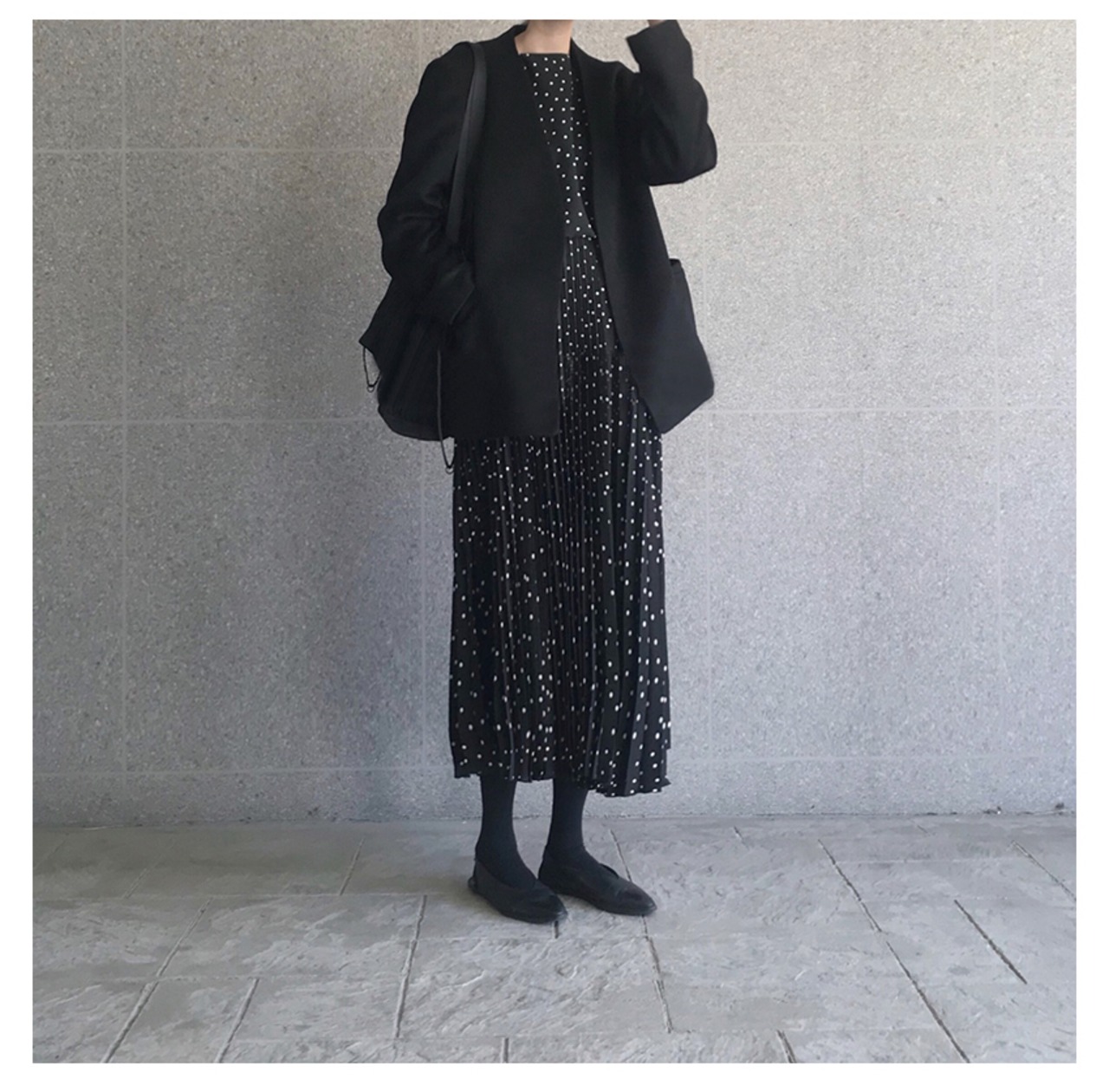 子供っぽくならない、大人の女性にぴったりのブラック地のドット柄ワンピは、ワントーンカラーコーデでクールに仕上げるのがオススメです☆