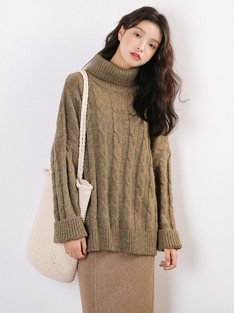 シンプルで落ち着いた印象のタートルネックケーブルニットです。