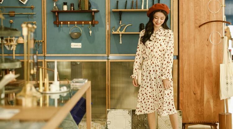 襟元や袖に施されたさりげないフリルがオシャレで、レトロな花柄がスカートの動きを華やかに見せてくれます。
