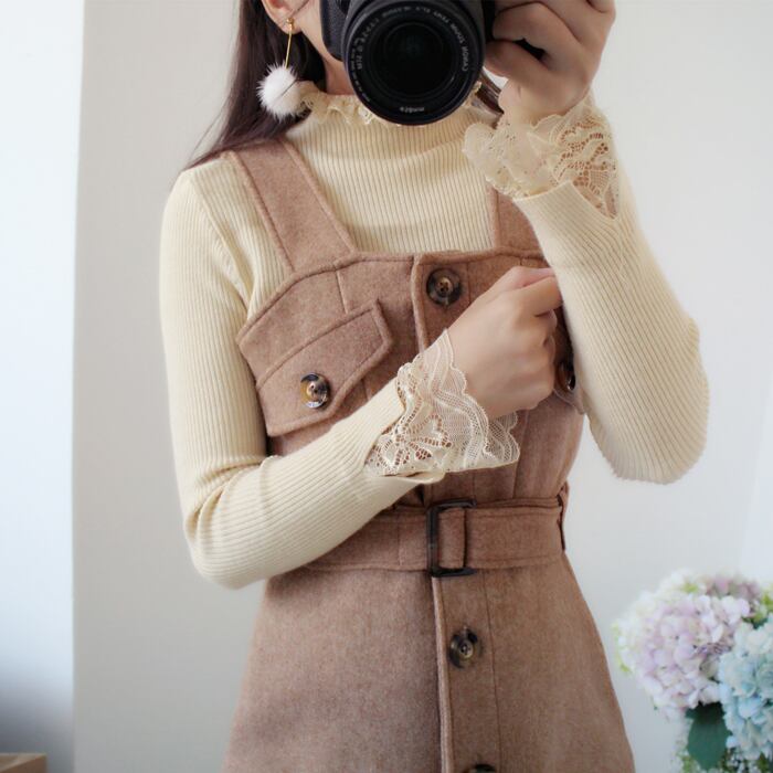 タートルネックニットやカットソー、レーストップスなどを合わせてクラシカルにまとめるルックがオススメです。