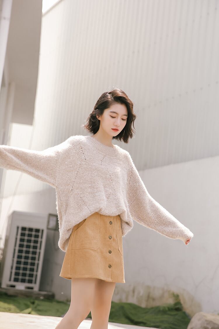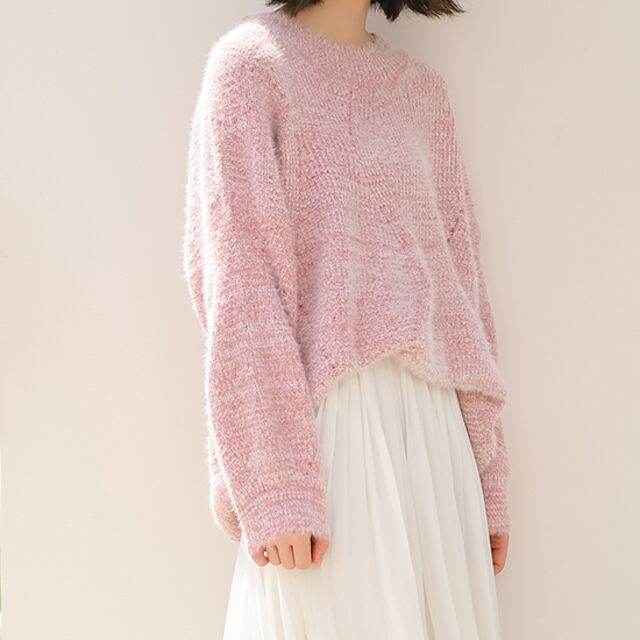 淡い色とフワフワ感が女性らしく華奢な雰囲気のクルーネックセーターです。