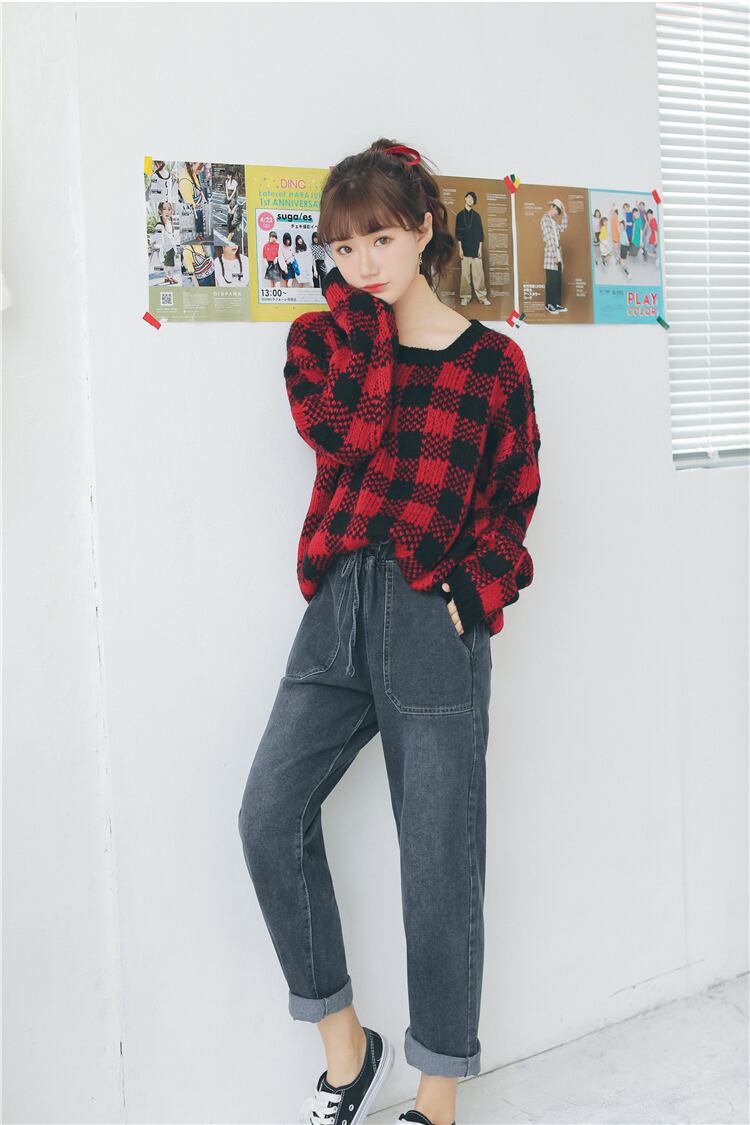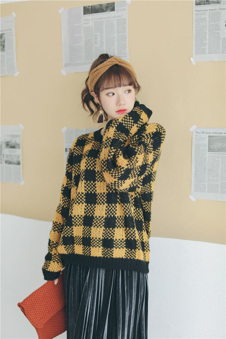 レトロな雰囲気のカジュアルなチェック柄クルーネックニットです。