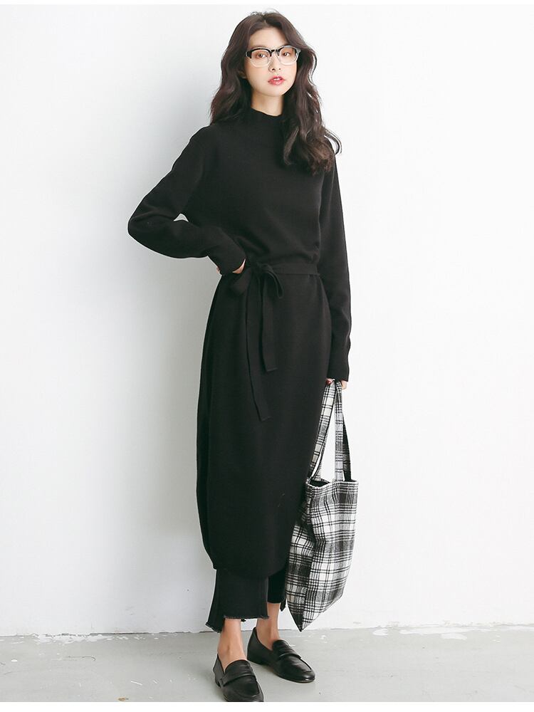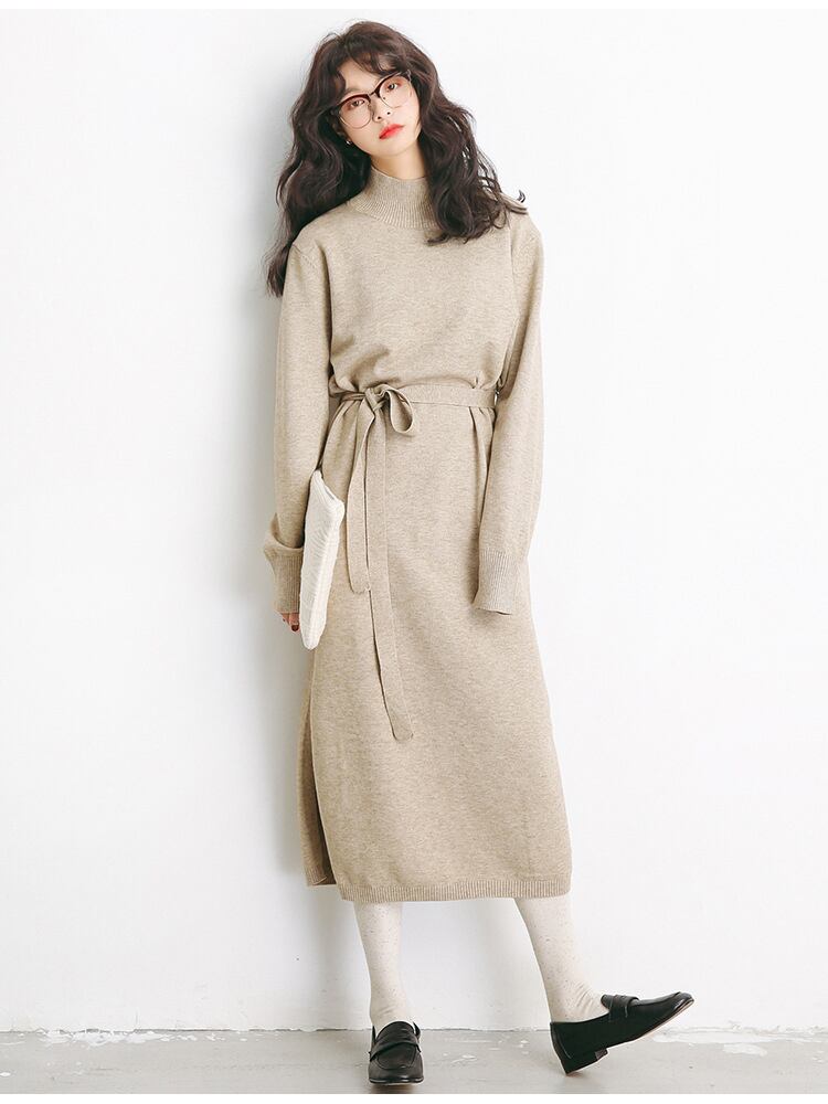 シンプルで大人っぽい雰囲気のロング丈ハイネックニットワンピースです。