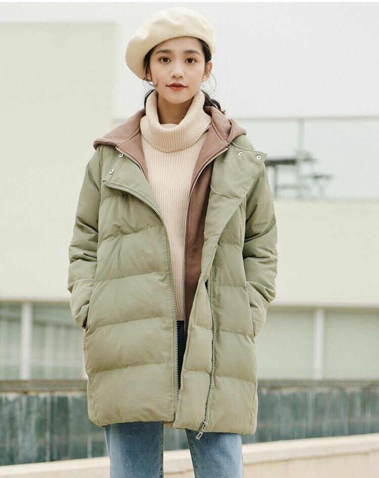 シンプルで優しいカラーが、どんなものとも合わせやすく女性らしい雰囲気のミドル丈ダウンコートです。