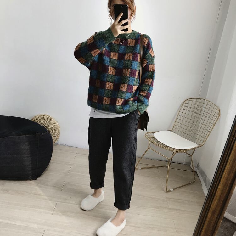 落ち着いた色合いで大人っぽくレトロな雰囲気のチェック柄クルーネックニットです。