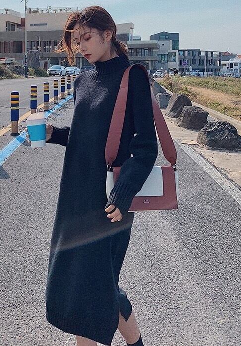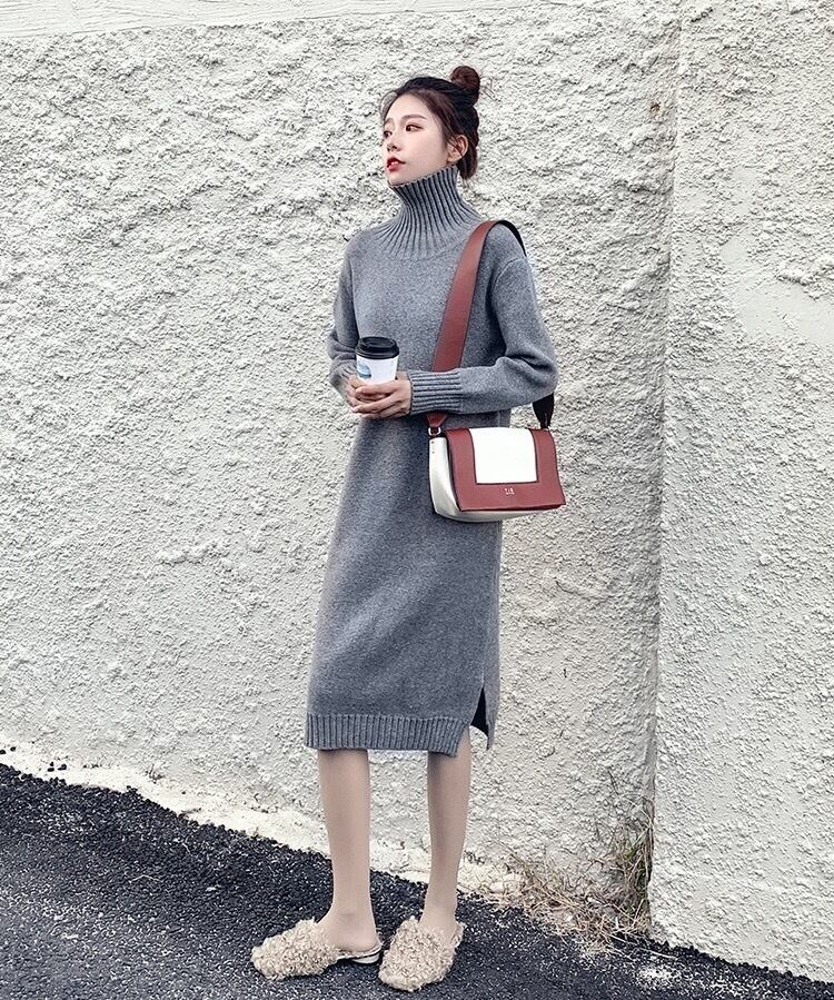 大人っぽく女性らしい雰囲気のタートルネックニットワンピースです。