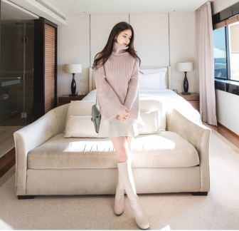 定番でシンプルなあぜ編みにオフタートルと幅広の袖で、上品さと可愛さを兼ね備えた万能ニット。