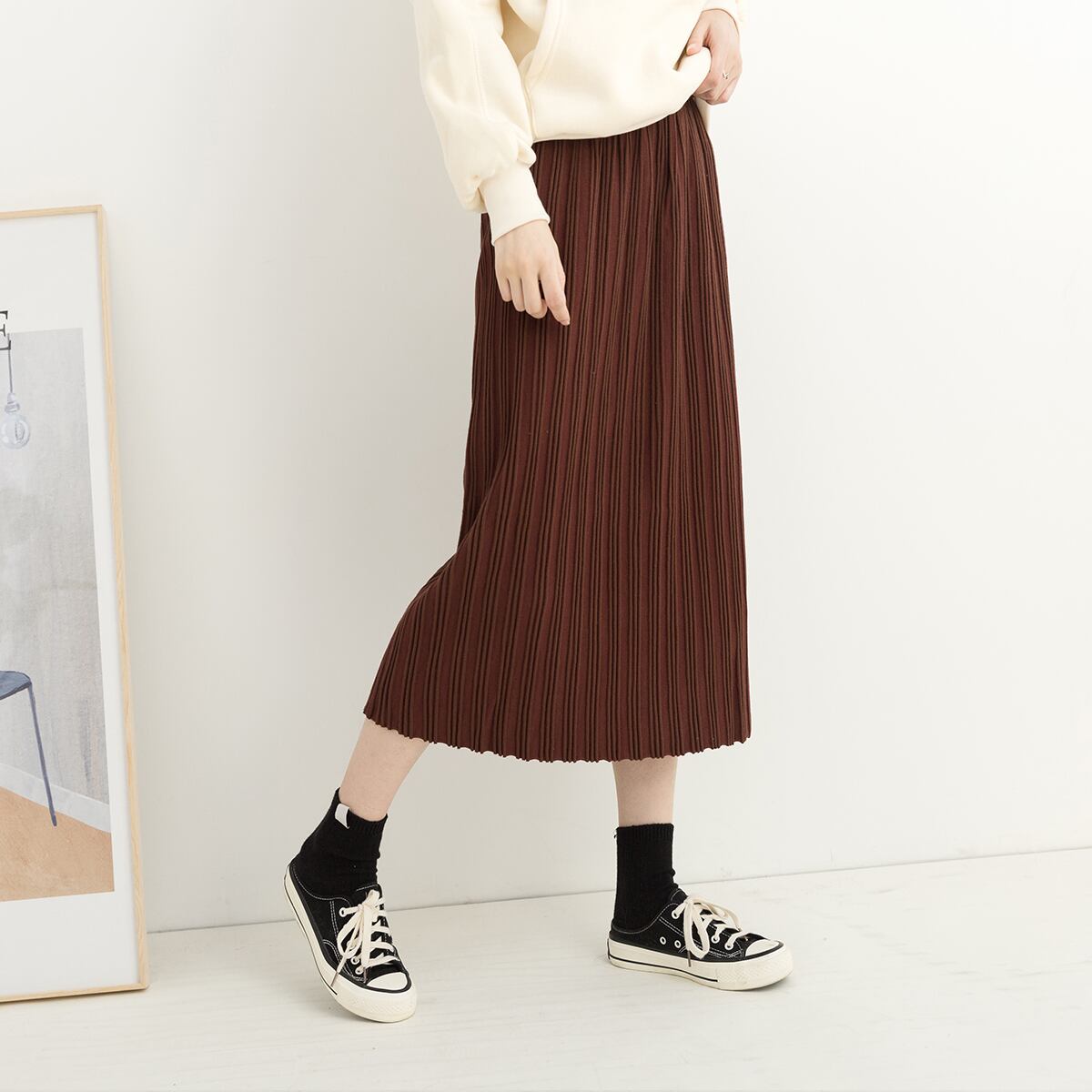 今季大注目のニットプリーツスカートは広がりすぎないシルエットでクラシックな印象に。