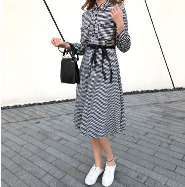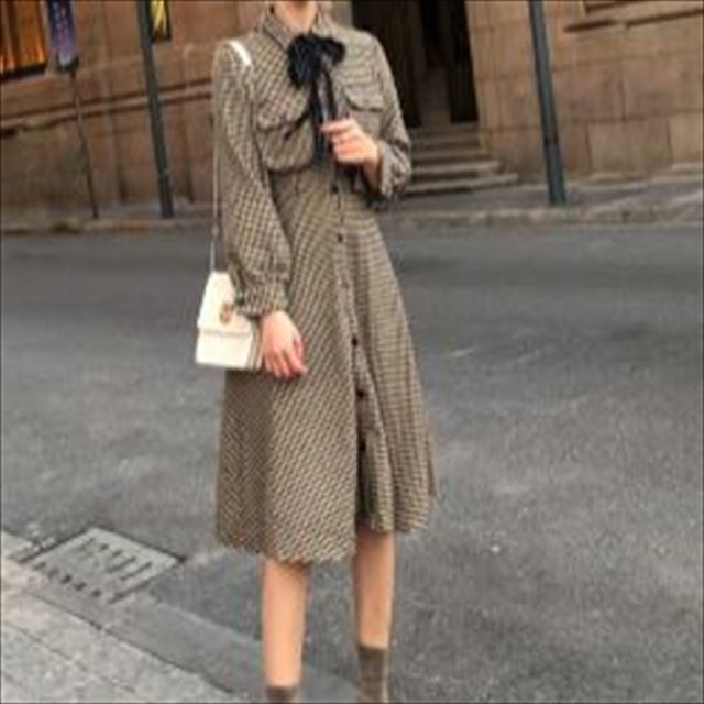 レトロ感のあるチェック柄にリボンがワンポイントとなったきれいめ膝下丈ワンピース。