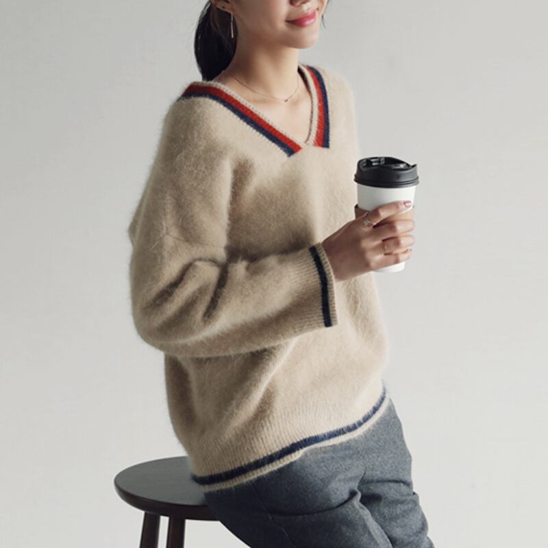 ネックラインと袖口に配色ラインをあしらったニットトップスです♪