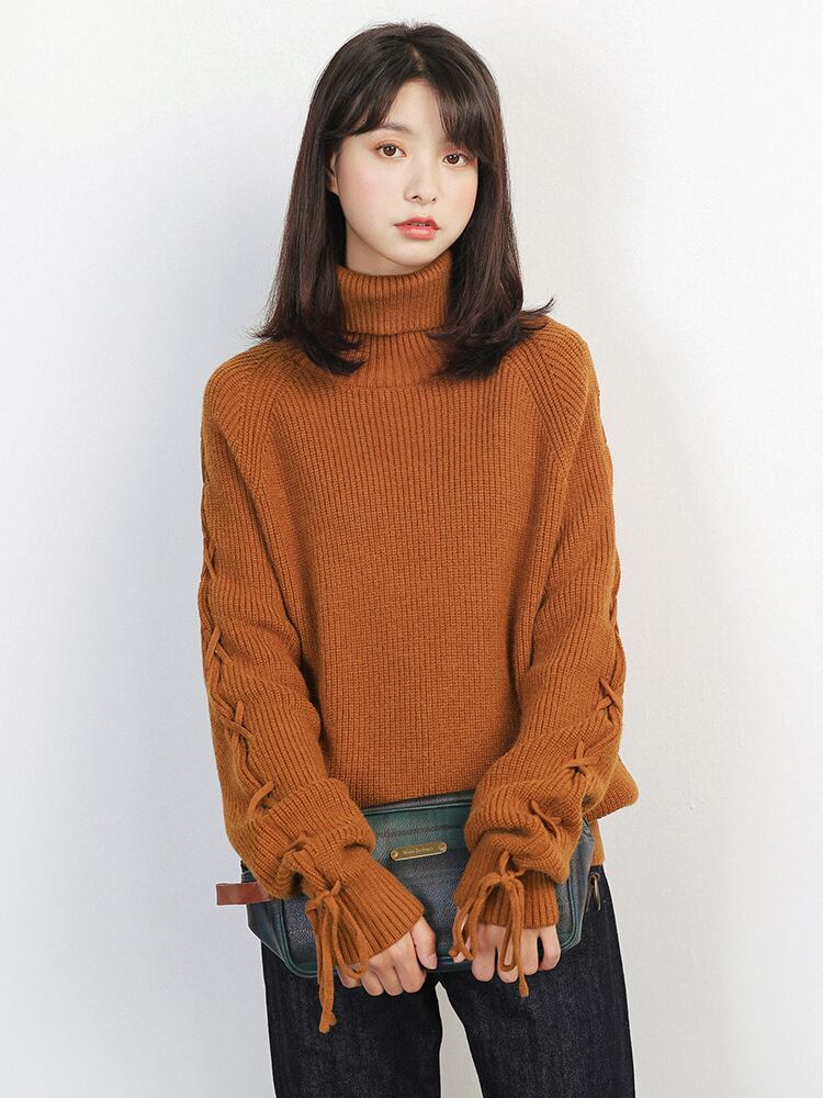 袖口の編み上げデザインがとってもオシャレなリブニット♪