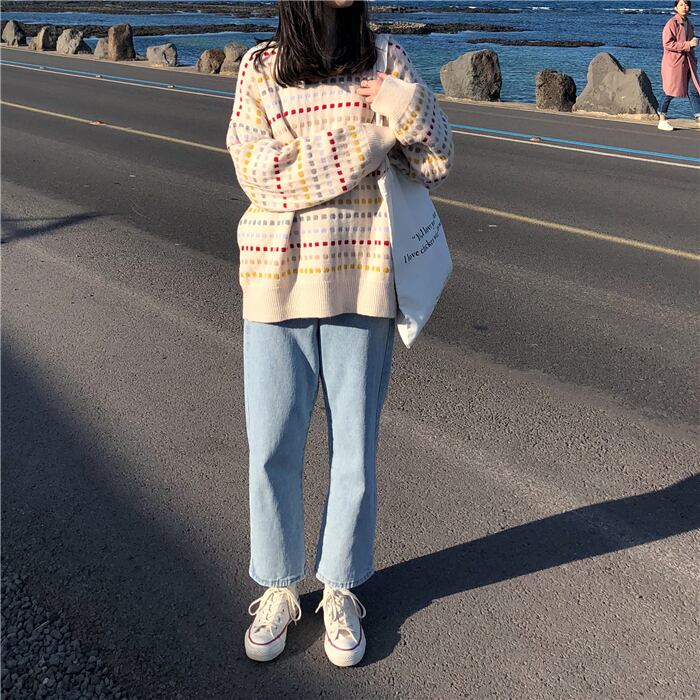 カラーレスになりがちな冬の時期によく映えるドット柄のニットトップス。