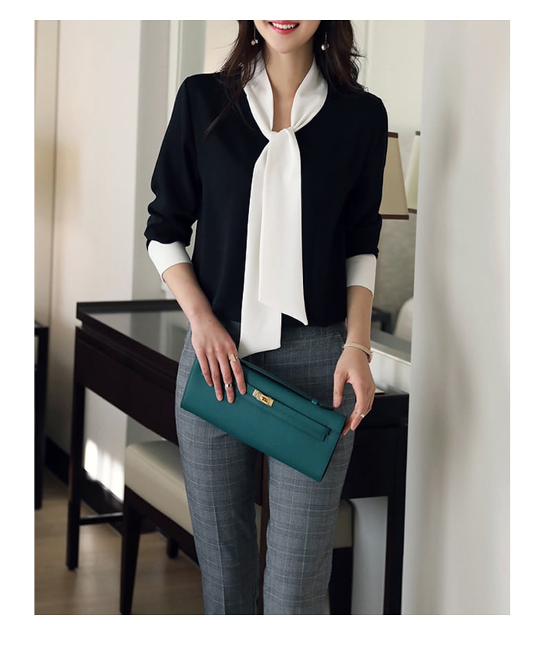 ao-08729_レディース シャツ ブラウス Vネック 春 ボウタイ きれいめ オフィス シフォン ブラック ブラウン