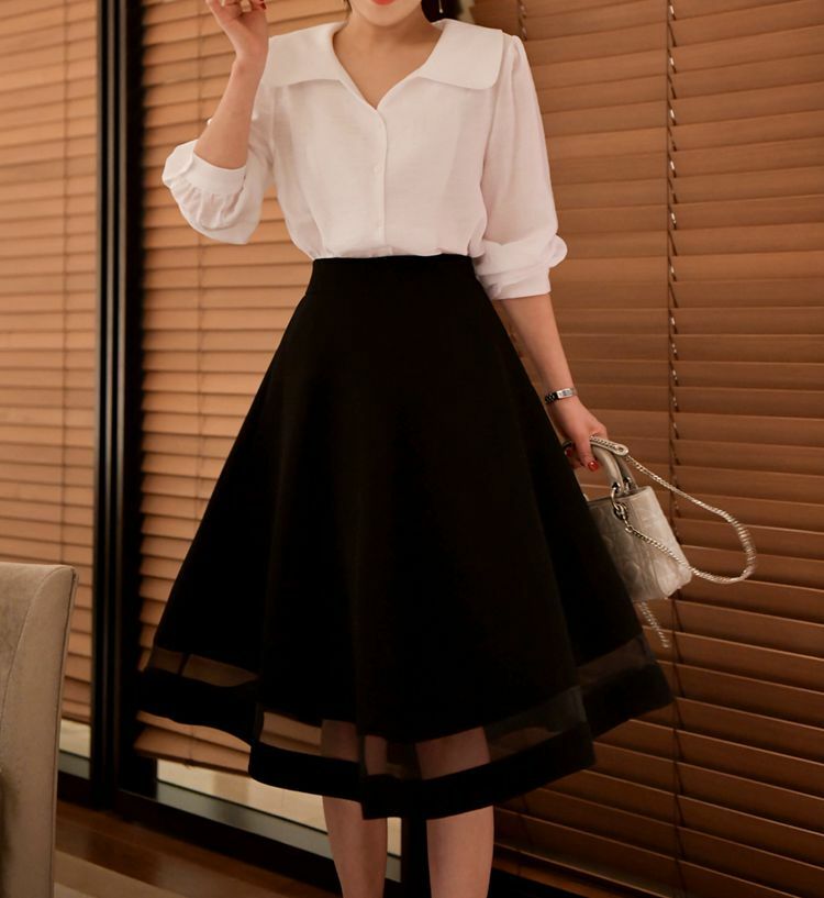 スカート ひざ丈 フレアスカート シースルー ハイウエスト シンプル 無地 白 黒 レディース 春夏 Z-20022