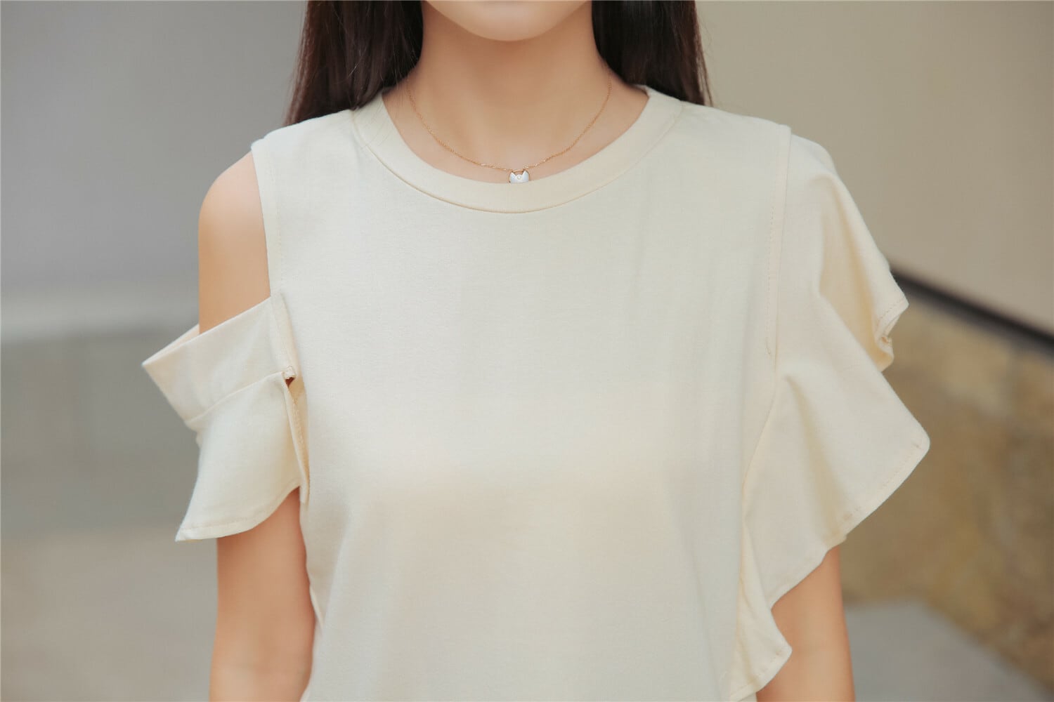 トップス ブラウス Tシャツ フリル ラウンドネック オフショルダー 半袖 アシンメトリー 不規則 スリット 大人可愛い 無地 黒 白 レディース 春夏 Z-20031
