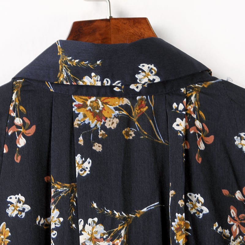 フリルシャツワンピース 花柄 膝丈 夏 秋 春 長袖 フラワープリント 大人可愛い リゾート リボン 旅行 ゆったり X-10044