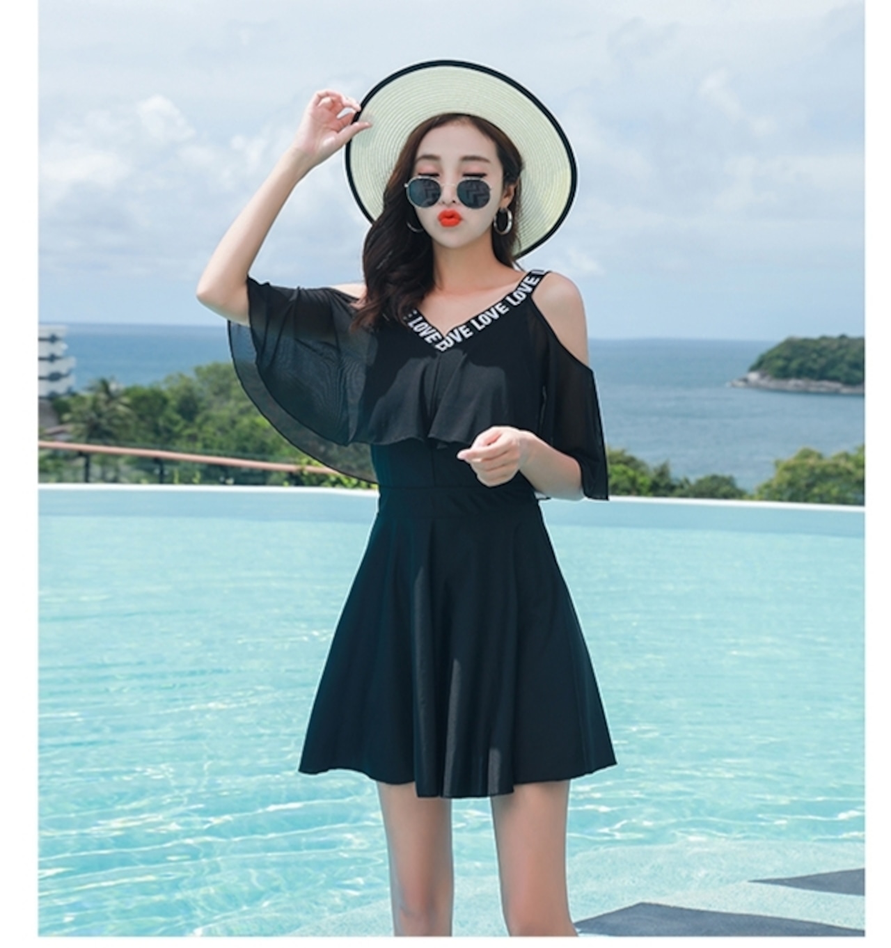 Z-20125 水着 ワンピース ロゴ オフショルダー ノースリーブ フレア シースルー 大人可愛い Vネック ハイウエスト 黒 レディース 無地 夏