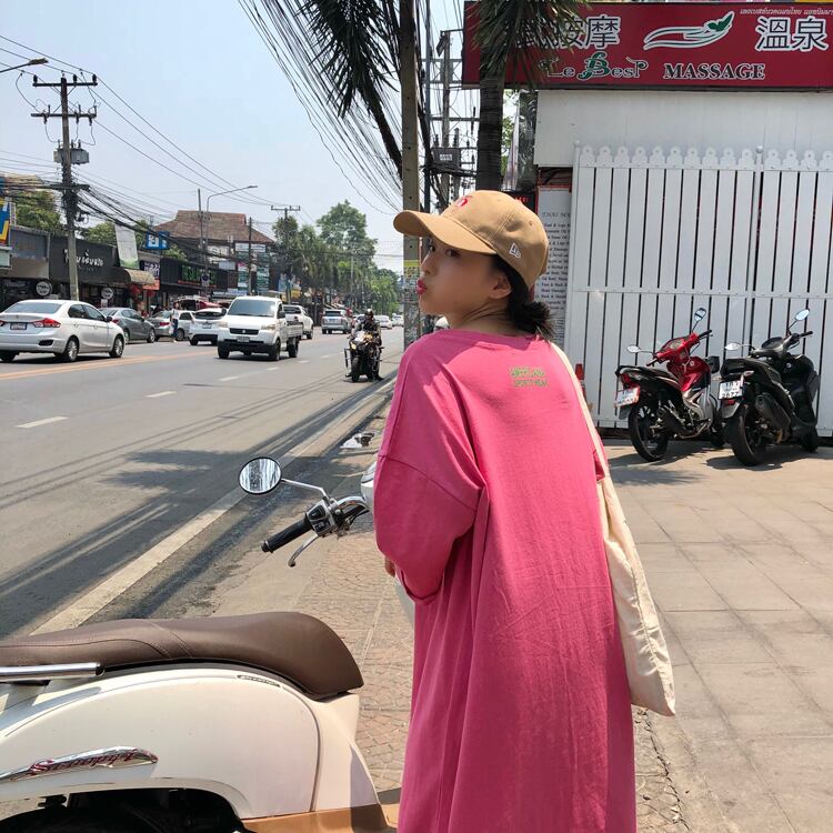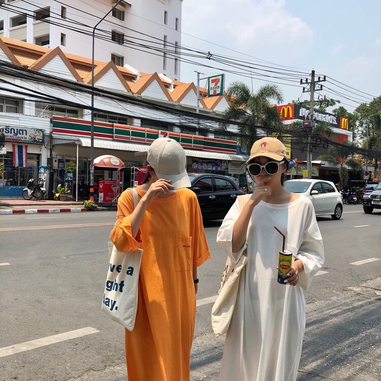 Z-20186 トップス ワンピース ロングTシャツ ルーズシルエット ゆったり 体型カバー Tシャツ ラウンドネック ミモレ丈 七分袖 綿 無地 シンプル オレンジ 赤 白 レディース 春夏 | K.M-base