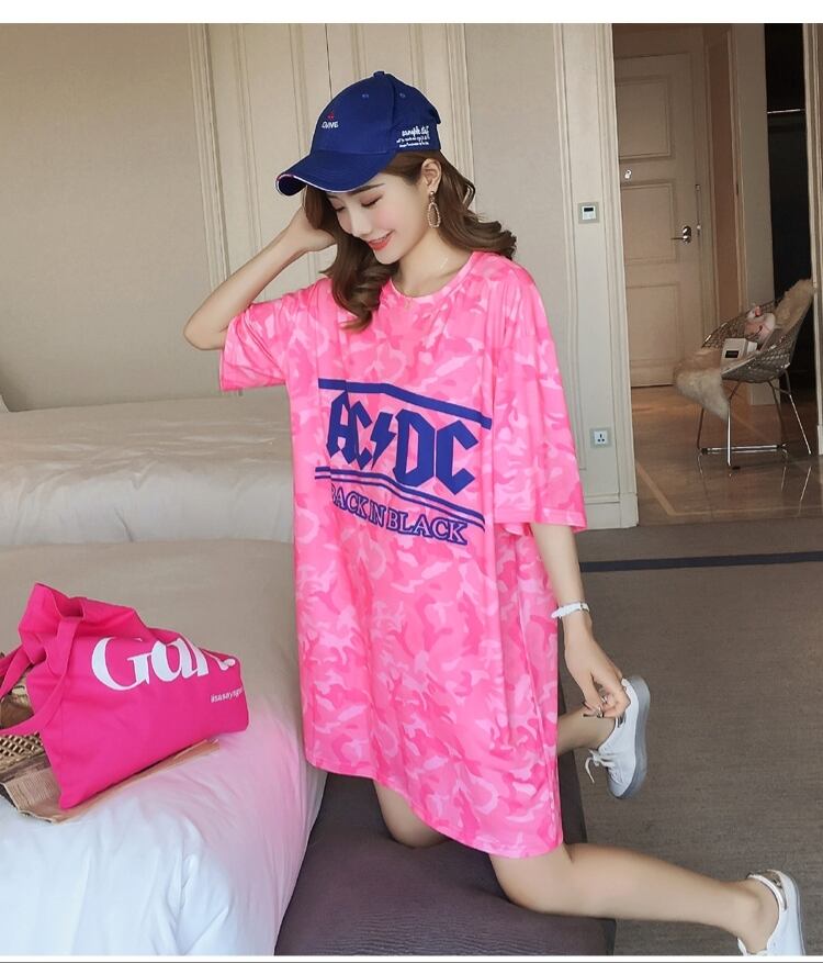 Z-20187 トップス ワンピース ロングTシャツ ルーズシルエット Tシャツ ラウンドネック半袖 ロゴ 迷彩柄 ピンク ビビッド カジュアル ルーズ ゆったり 体型カバー ひざ丈 レディース 春夏 | K.M-base