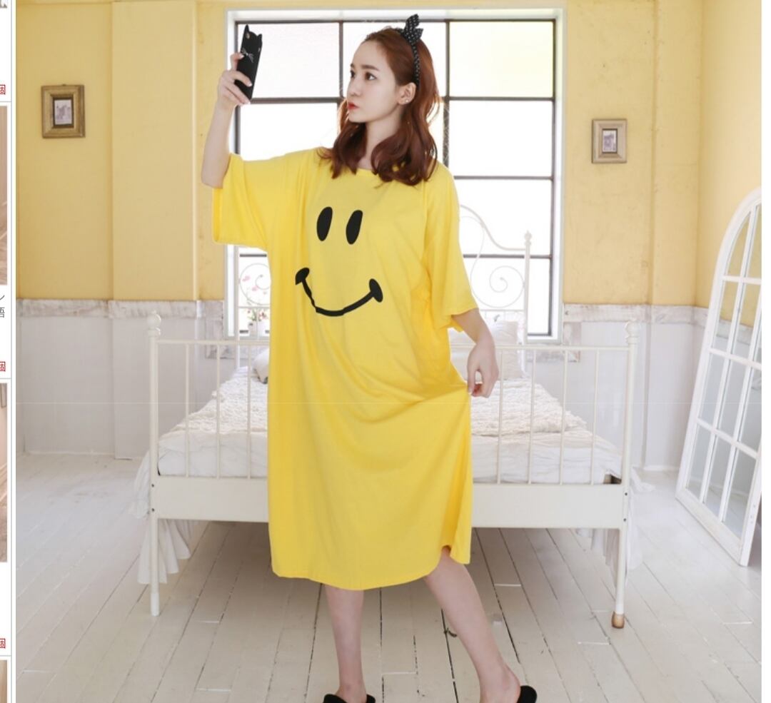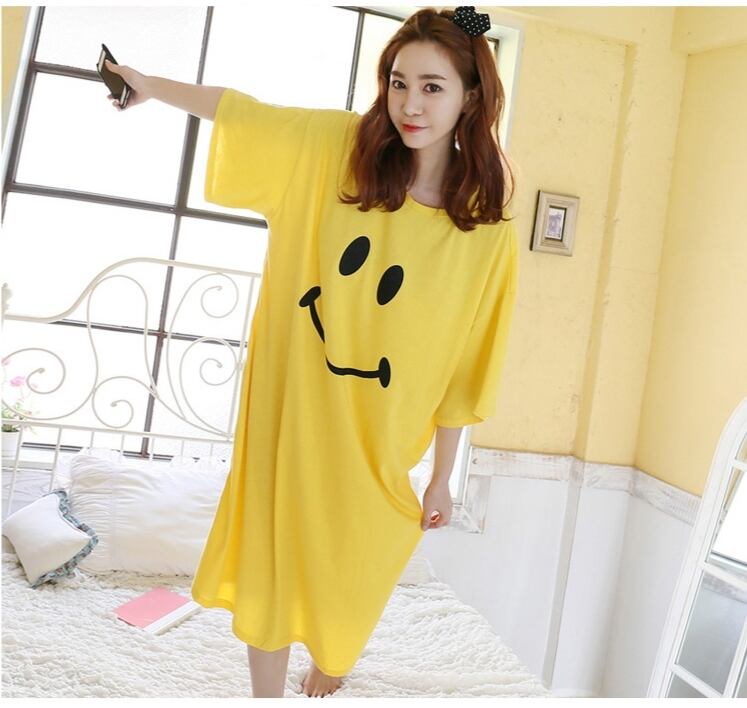 Z-20188 トップス ロングTシャツ ワンピース ひざ丈 ミモレ丈 ラウンドネック 半袖 黄色 スマイル シンプル 無地 カジュアル ルーズシルエット ゆったり 抜け感 こなれ感 レディース 春夏 | K.M-base