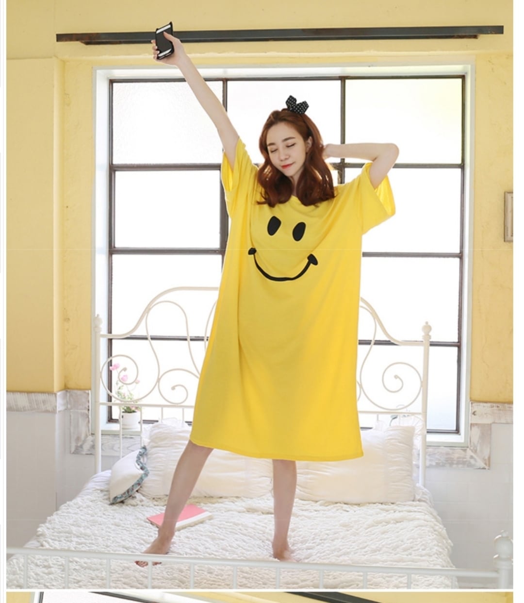 Z-20188 トップス ロングTシャツ ワンピース ひざ丈 ミモレ丈 ラウンドネック 半袖 黄色 スマイル シンプル 無地 カジュアル ルーズシルエット ゆったり 抜け感 こなれ感 レディース 春夏