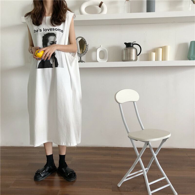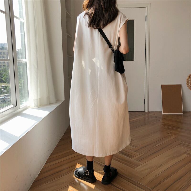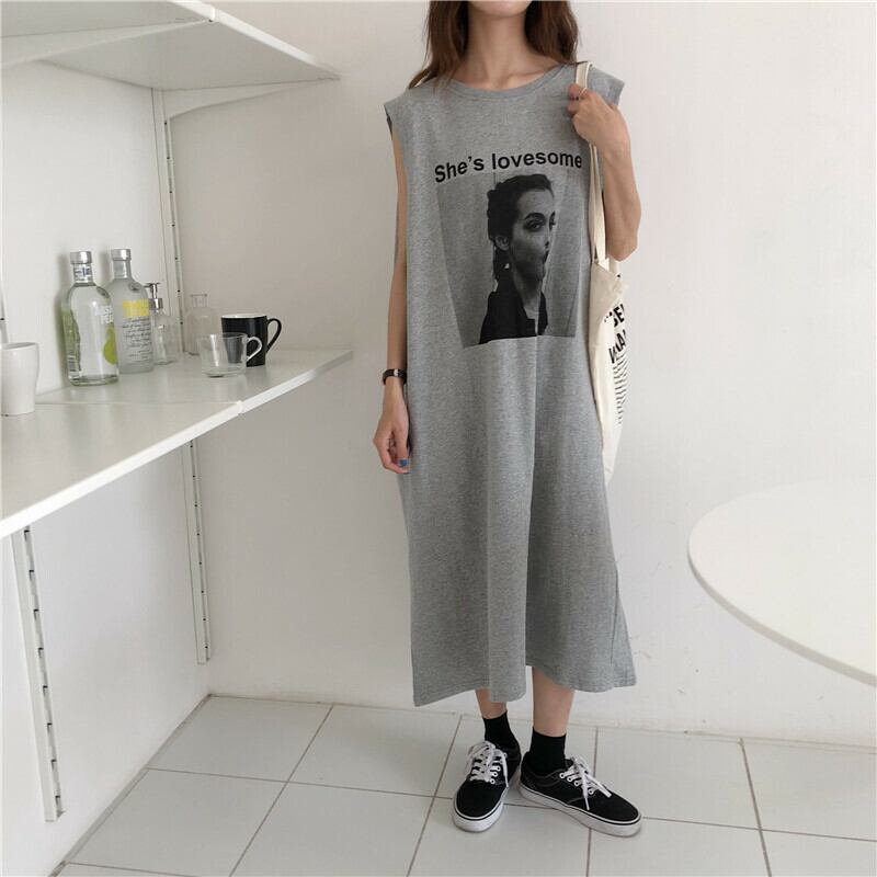 Z-20191 ワンピース ロングTシャツ ロングワンピース ミモレ丈 マキシ丈 カジュアル プリント Tシャツ ノースリーブ 半袖 スリット 綿 ゆったり ルーズシルエット 体型カバー レディース 春夏 | K.M-base