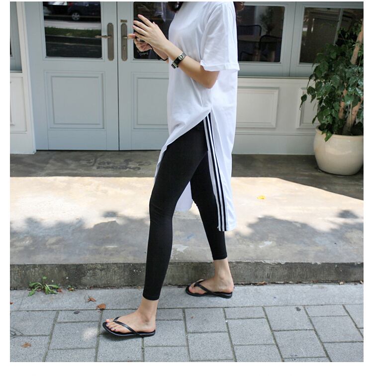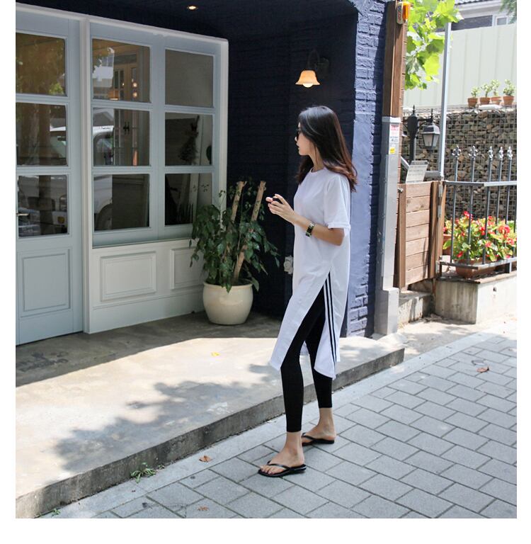 Z-20200 ワンピース Tシャツ ロングTシャツ スリット 無地 ストライプ フレア 五分袖 半袖 ラウンドネックトップス 白 ゆったり ルーズシルエット カジュアル レディース 春夏 | K.M-base