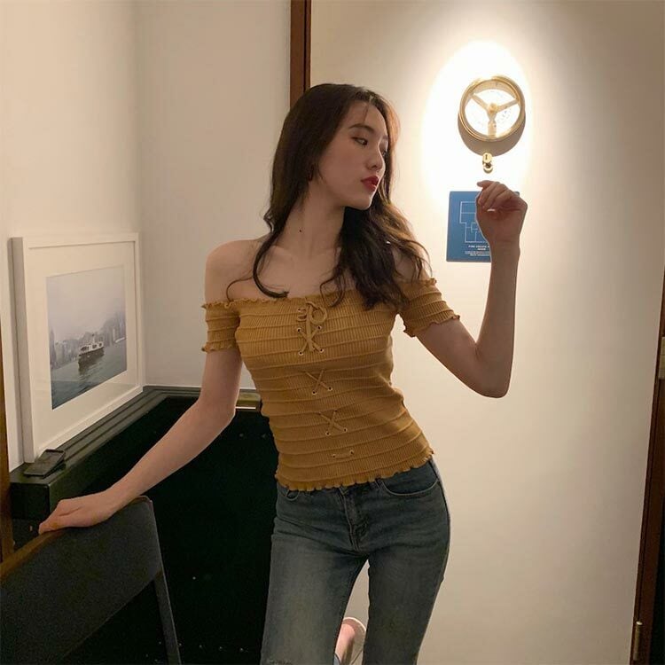 Z-20268 トップス Tシャツ オフショルダー 半袖 フリル レースアップ スクエアネック シンプル 無地 白 黒 シック 大人可愛い セクシー レディース 春夏