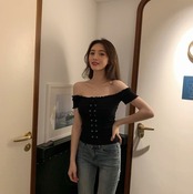 オフショルダースタイルがレースアップと、さりげないフリルとマッチしていてガーリーです◎